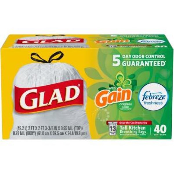 Tall kitchen trash bags provide continuous odor neutralization and leave behind fresh scent. Reinforcing bands add strength. Drawstring makes closing and carrying easy.