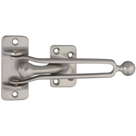 National catalog model No. V1928. This door guard is designed for added security and as a decorative accent in houses and apartments. Partial opening of the door is permitted for ventilation or viewing while resisting possible forced entry. Cannot be unlocked from the outside. Guard is easy-to-install and operate. Designed to prevent damage to the door and trim when opening and closing. Made of solid brass. 1 per pack.