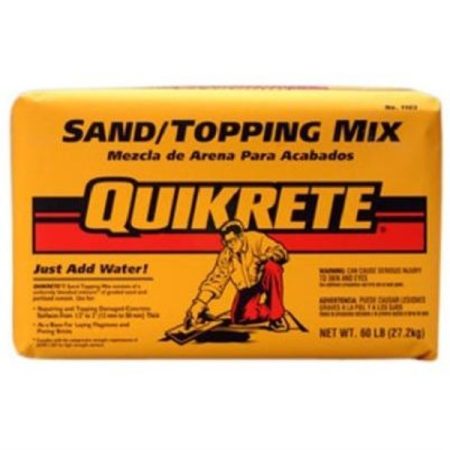 $3.00QUIKRETE Sand/Topping Mix consists of a uniformly blended mixture of portland cement, commercial grade sands and other approved ingredients. Use For: Repairing and topping damaged concrete surfaces less than 2″ thick Chimney Caps Large Crack Repair Thick beds for ceramic floor tile Filling cores in masonry block walls