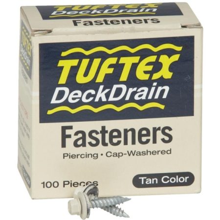 $9.50For use with the Tuftex DeckDrain system. These fasteners provide optimum fastening strength and durability, and are painted to match Tuftex DeckDrain panels. 1″ self-tapping, hex head, and washered. 100 fasteners per box. Approximately 30 fasteners needed per 10′ panel. 3/8 In. hex drive bit size.