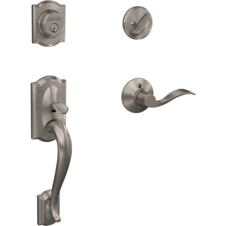 $82.50The Schlage Camelot Handleset with Single Cylinder Deadbolt and Accent Lever in Satin Nickel is perfect for use on exterior front doors. The Accent Lever is widely popular for its elegant wave-like design that effortlessly matches a rooms style without overshadowing it, while the Camelot handlesets scalloped architectural details make…