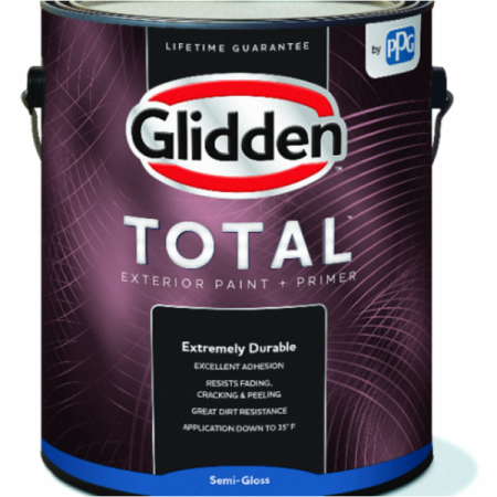 $21.50Glidden Total exterior paint + primer is extremely durable and offers protection in all climates, season after season. With low temperature application and excellent adhesion you don’t have to wait for warm weather to get the job done. This paint resists fading, cracking and peeling and has great dirt resistance…