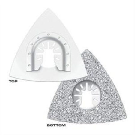 Crushed carbide blade is designed for coarse grinding or rasping of grout, porous concrete, masonry, hardened adhesives, thinset, plaster, or aggressive material removal over large areas. Features ONE FIT universal system allowing blades to fit most multi-tools/oscillating tools. Adapter included to fit Dremel Quick Release & old Rockwell.