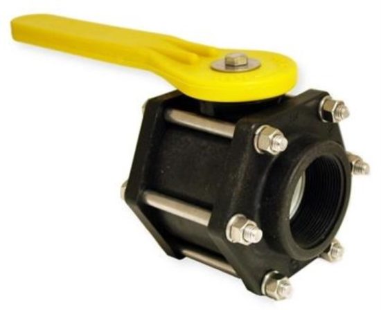 2-inch full port ball valve. Glass reinforced polypropylene for strength and durability, will never rust or corrode. Body to flange design allows for low torque On/Off operation. Self aligning ball rotates freely. 125 PSI (pounds per square inch) at 70 degrees. Bolted.