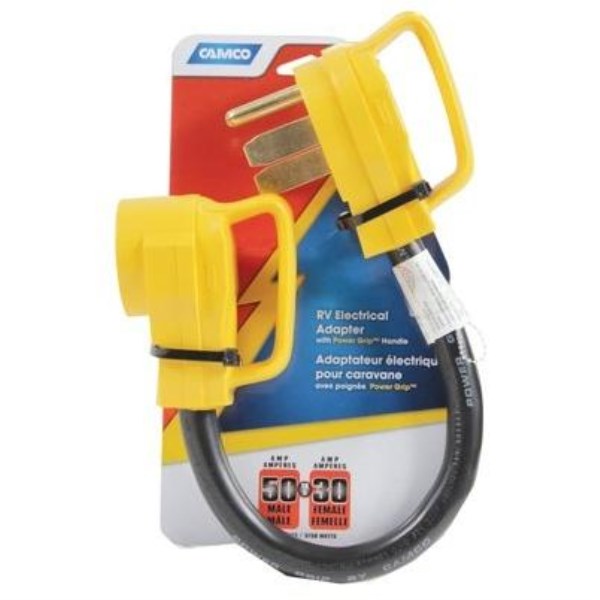 Power grip dogbone adapters with handles to make unplugging easier. Handles are made of polyvinyl plastic. For use in RVs.