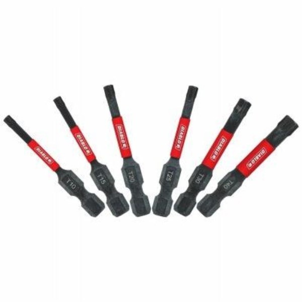 Diablo’s driver bit range of Torx bits delivers maximum performance, extreme durability and up to 50x longer life when installing and removing fasteners. An optimized tip design provides a strong, precise grip that reduces wear, stripping and slippage. Optimized heat treatment process strengthens the bit for impact resistance and stability. Torque Resistant Design absorbs torque for less stress at the tip when tightening and removing nuts and screws. This range is Impact Strong, delivering increased shank stability and durability in cordless and corded impact and drill drivers. Rust protection coating for superior wear and corrosion resistance. Laser engraved bit type and size for easy identification. Assorted pack includes six Torx drive bits: #10, #15, #20, #25, #30 and #40.