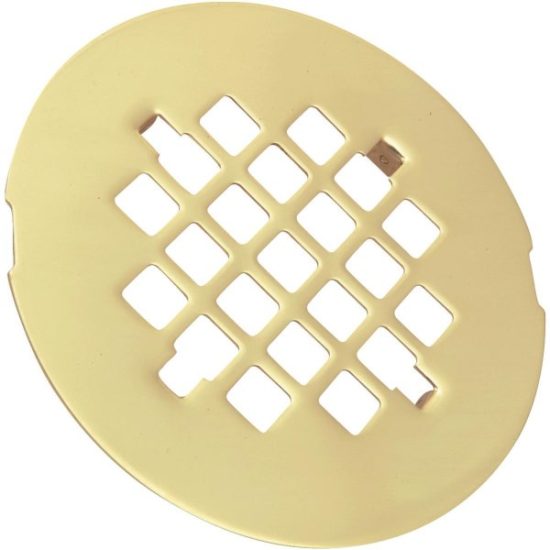 Snap-in style. Polished brass. Fits most standard shower drains. 4-1/4″ diameter.