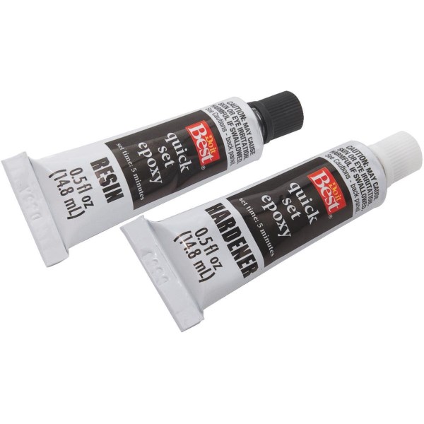 Quick setting epoxy adhesive fills small gaps. This product repairs appliances, tool, cookware, etc. Resists acids, oils, salt water, and solvents. Bonds metal, wood, glass, china, fiberglass, and more. 1200 psi strength. Sets in 5 minutes and 24 hours to cure. Includes (2) 1/2 Oz. tubes (hardener and resin).