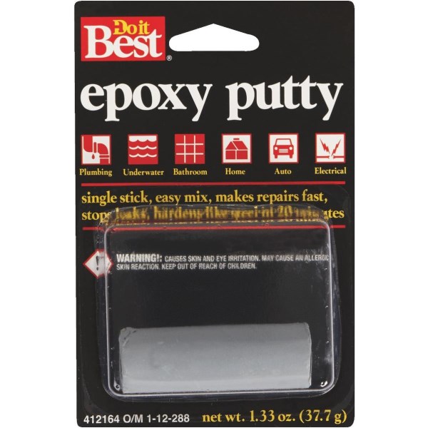 Epoxy putty hardens like steel in 20 minutes. Ideal for plumbing, electrical, auto, and home repairs. Plugs, seals, patches holes, and cracks and mends almost anything broken. Can be used for underwater repairs. Excellent for fabricating or rebuilding parts and for use as an all-purpose adhesive for metals, wood, glass, masonry, ceramics, and many plastics. Can be drilled, tapped, filed, sanded, and painted like metal. NSF certified for use in potable water applications. Do not use with polyethylene or polypropylene.