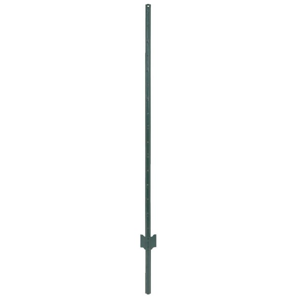 14-gauge rugged steel construction U-shaped post. Post is 1-1/8 In. W. x 5/8 In. D. with a 3 In. x 3-3/4 In. swedged anchor plate. Tabs and 7/32 In. holes alternate starting with a clip near the top. Hole to hole or clip to clip are 6 In. apart. Polyester powder-coated green finish.