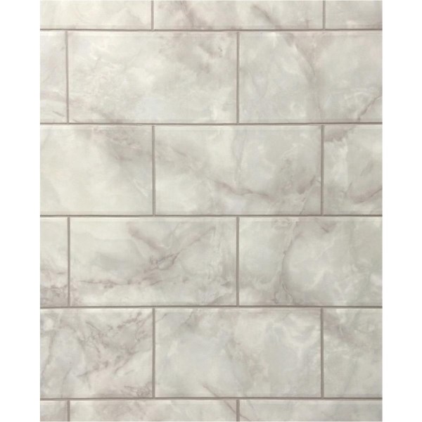 Gray marble subway tile that can be used in high moisture areas with proper installation. Easy to install using common household tools. Made with high quality hardboard. No formaldehyde or VOCs (Volital Organic Compound).