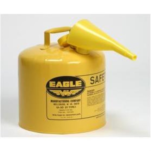 Galvanized Type I cans meet OSHA (Occupational Health and Safety Administration) and NFPA (National Fire Protection Association) Code 30 requirements and are UL (Underwriters Laboratories) and ULC (Underwriters Laboratories of Canada) listed and FM approved for safe handling and storage of gasoline and other flammable liquids. Features environmentally friendly Lead Free Technology, constructed of 24-gauge hot dipped galvanized steel. Patented Comfort-grip trigger release, spring closing lid with neoprene gasket vents a 5 psi (pounds per square inch) internal pressure. Non-sparking brass flame arrestor and pour spout. Deep drawn construction means no top or side beams. Baked on powder-coat finish. Trilingual label.