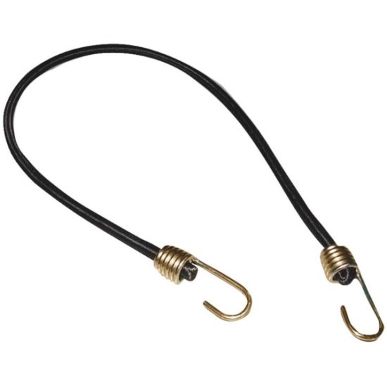 Industrial grade bungee cord has a black nylon covering. Hardened wire hooks are covered with yellow dichromate finish to prevent rusting.