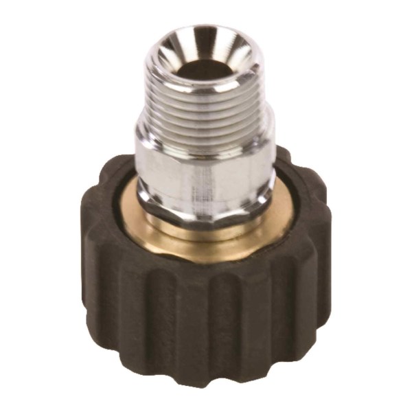 Male screw coupling connects to most common 1/4 In. and 3/8 In. pressure washers. Ideal for connecting hoses together. Converts M22 metric thread size to standard thread size. 300 degree F. 5800 psi.