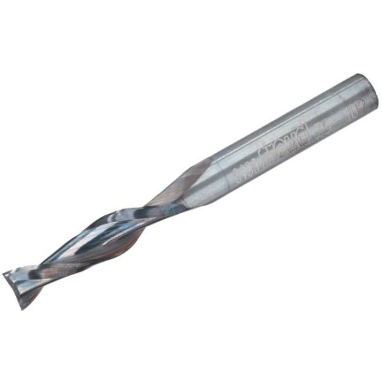 Carbide up or down spiral bits combine effective chip removal with a cut as compared to standard straight bits. Double flutes. Computer designed flutes provide the chip removal required in production settings. For cutting mortises, grooves, dadoes, and routing deep blind holes with effective chip removal. Carded.