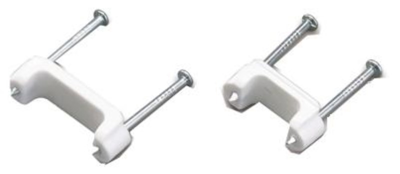 Plastic insulated staples used to attach NM, UF, and other type NM cable up to 3-conductor (No. 10). Fast and easy-to-install, both of the zinc-plated nails can be driven together without splitting wood. Nail heads recess into the staple for minimum exposure. Made of high-grade UV (ultra violet) resistant polyethylene, they will resist rot, rust, and resist the effects of temperature extremes and the degradation of the ultraviolet rays of sunlight. 15/clamp.