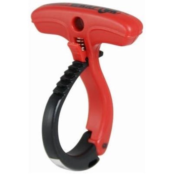 Cable Wraptor cable tie. T-handle feature allows for easy carrying from one job to the next. Large hang hole is ideal to store and hang. Large teeth design for secure locking system. Easy release trigger. Cable tie looping hole for permanent attachment. Spring-loaded hinge helps close tail.