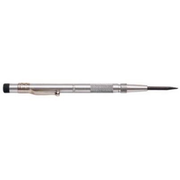 Punches, marks, scribes, and starts nail or screw holes. Lightweight aluminum body with alloy steel point for long wear. Adjusts for light or heavy markings. Pencil slim design with pocket clip.