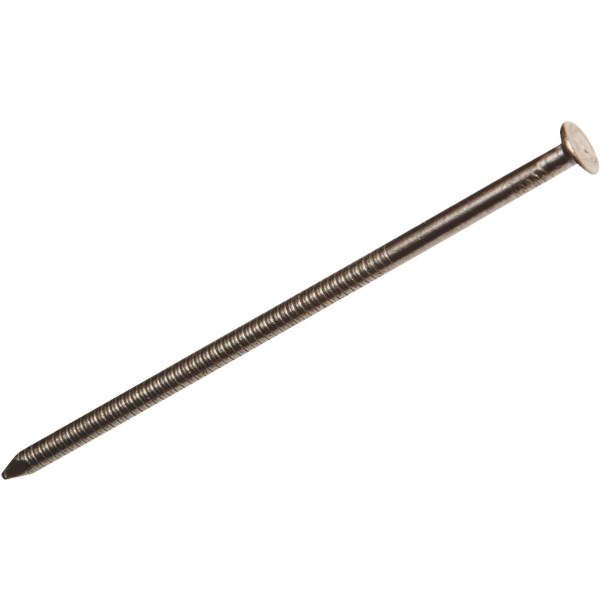 Bright ring shank, oil quenched with flat countersunk head and diamond point. Safety glasses recommended when driving hardened nails. 50 lb. carton.