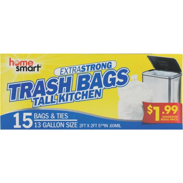 Home Smart medium drawstring style trash bags for easy portability. Extra strong design for heavy and dirty applications. Closure ties included.