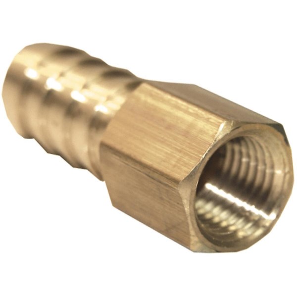 Barbed x female pipe thread adapter. Brass. Use with plastic tubing or rubber hose.