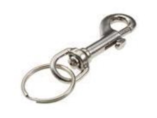 Fastens securely to a belt loop, purse strap or similar item and features a loop which rotates 360 deg (degree).