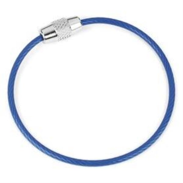 Twisty key ring made of strong, flexible corrosion-resistant aircraft cable. The patented locking unit is opened and closed by forming a figure 8. Nylon coated cable in assorted colors: Clear, black, blue, green, red, and purple. 5 inches long. 1 per card.