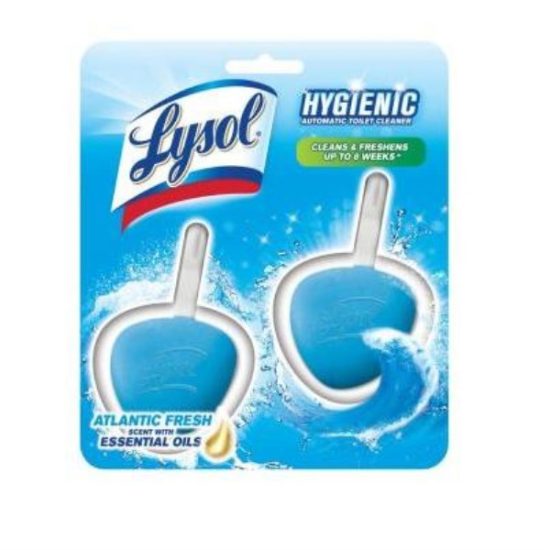 Lysol automatic toilet bowl cleaner complete clean tabs is the only toilet bowl cleaner that delivers antibacterial protection molded into the hang-up hook to resist odor-causing bacteria. No more touching of germy, dirty hooks each time you replace. The average tablet lasts 4 weeks. Concentrated cleaning soap tab dissolves over the 4 week period to deliver fresh clean scent and powerful cleaning agents to keep your bowl Lysol clean and fresh with every flush. Comes in a handy 2-pack for up to 8 weeks of clean toilet bowls. The flexible hang-up hook adjusts to fit any type of bowl rim possible. The best place for the tab to hang is towards the back of the bowl to the right of center, not in the direct path of the bowl refill water to prevent splashing, but still in touch with bowl refill water to clean with every flush. 2-pack.