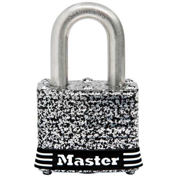 Laminated steel padlock features a laminated steel body design with a tough weather coated finish for maximum strength and reliability. The stainless steel shackle offers maximum resistance to cutting and sawing. The brass 4-pin cylinder and dual locking levers provide resistance against picking, prying and hammering. The limited lifetime warranty provides peace of mind from a brand you can trust.