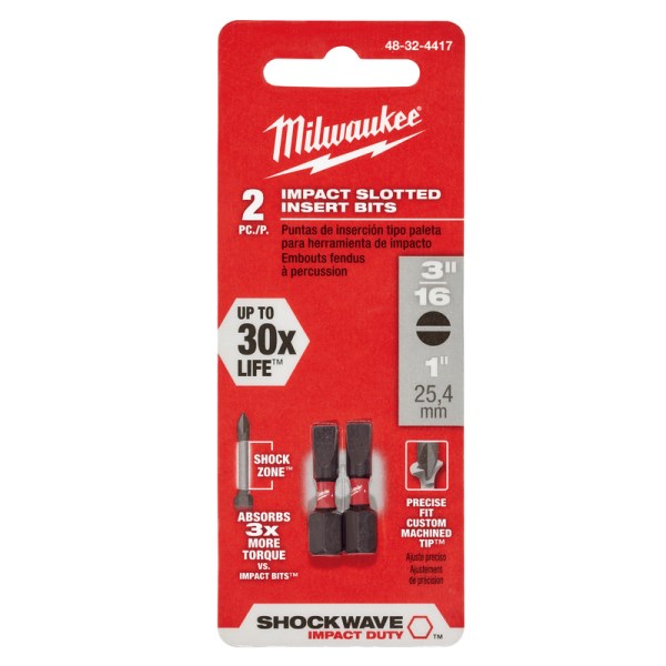 Milwaukee Shockwave Impact Duty driver bits are engineered to be the most durable, best fitting driver bits on the market. The optimized Shockzone geometry is unique for each tip type to provide up to 30x longer life and absorbs 3x more torque vs. other impact bits. The Precise Fit Custom Machined Tip prevents stripping and reduces wobble while the Custom Alloy76 Steel and proprietary heat treat process maximizes resistance to wear and shock. Shockwave driver bits are built to deliver extreme durability for the most demanding applications. Shockwave Impact Duty driver bits can be used in impact drivers or drill drivers.