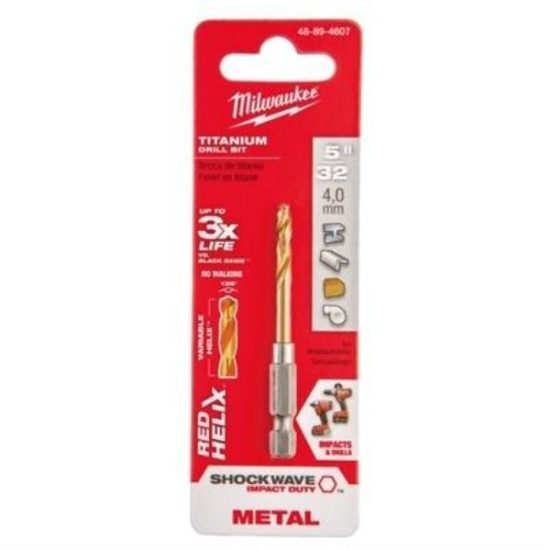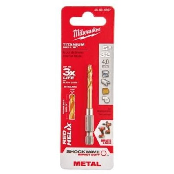 The Milwaukee SHOCKWAVE RED HELIX Titanium Drill Bits are engineered for extreme durability and long life. The 135 degree Split Point Tip Provides a Precision Start and Prevents Walking. The VARIABLE HELIX design includes an aggressive 35 degree helical angle, which ends at 15 degrees, these titanium drill bits with RED HELIX provide Rapid Chip Removal limiting heat buildup to Stay Sharper Longer. The bits also feature an internal ENHANCED TAPERED WEB that greatly increases their strength, reducing premature breakage. The titanium drill bits are ideal for various applications, including but not limited to wood, plastics, and metals. Pro Packs feature 5 bits of the same diameter, each bit providing up to 5X life vs. Black Oxide Drill Bits.
