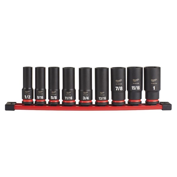 The MILWAUKEE 9-Piece SHOCKWAVE Impact Duty 1/2 in. Drive SAE Deep 6 Point Socket Set features the boldest, longest-lasting markings and extreme impact durability in high torque applications. The stamped and ink-filled size marking makes selecting the right socket every time easy throughout the life of the socket. These Milwaukee sockets are engineered with high strength forged steel for optimized performance in heavy-duty applications. The non-slip hex geometry prevents fastener rounding, and a dual-hole design and ring groove allow for easy socket attachment and removal. The customizable Socket Rail comes with removeable end caps to add or take off socket clips for optimal storage. All SHOCKWAVE Impact Duty Sockets backed by a Lifetime Guarantee and meet ASME industry standards. Includes (9) deep SAE sockets: 1/2 In., 9/16 In., 5/8 In., 11/16 In., 3/4 In., 13/16 In., 7/8 In., 15/16 In., and 1 In, with socket rail.