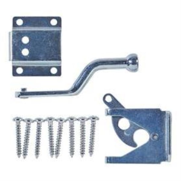 For swinging doors. Latches when bar strikes latch lever. Floating bar adjusts to compensate for 1/2″ gate sag. Designed for right or left hand applications. Can be padlocked for added security. Patent Pending.