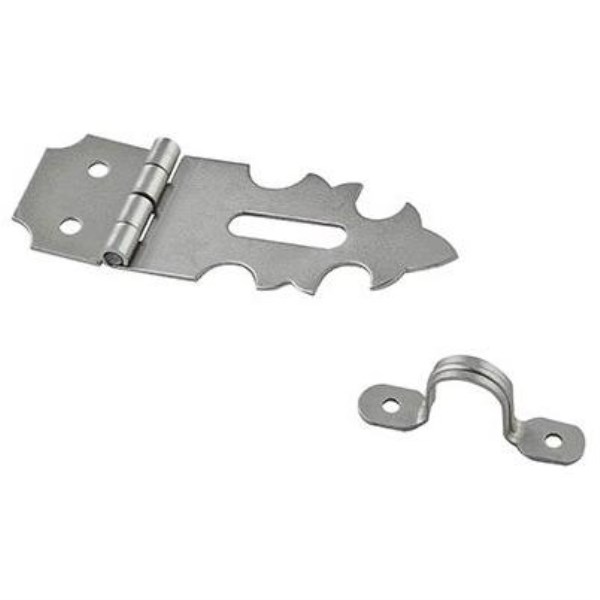 National catalog model No. V1824. Miniature brass. Designed to add a decorative appearance to small chests, jewelry boxes, craft projects, etc. Hasp style matches National’s model No. 1810, 1811, and 1816 decorative hinges. Can be used with national’s model No. 1880 padlock. Surface mount. Made of solid brass. Screws included. 1 per pack.