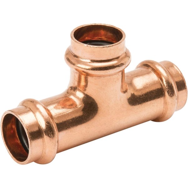 Copper press tee. For flameless, plumbing or mechanical press joining suitable for Type K hot and cold potable water. Applications include potable water, hydronic heating, chilled water, compressed air, non-medical gases, low pressure steam and vacuum. Approved for installations in above and below ground applications as allowed by local code. 200 psi CWP operating pressure, -20 F to 250 F temperature range.