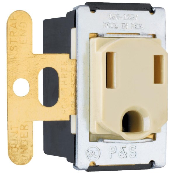 15 amp ivory interchangeable receptacle. Ideal for use with interchangeable devices to create numerous combinations of electrical outlets in tight spaces. Must be installed in end opening of strap with ground lead. UL (Underwriter’s Laboratories) listed.