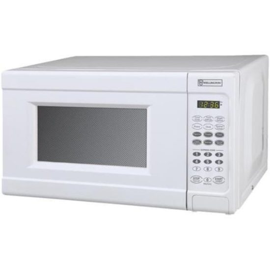 Countertop microwave features removable glass turn table, defrost setting, electronic controls with LED (light emitting diode) display, membrane control panel, and push button open door. 11 power levels, 6 quick set menu buttons, 30 second express cooking, timer, and clock.