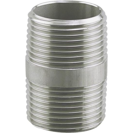 No. 304 Schedule 40 stainless steel nipples are ideal for potable water, under ground and irrigation systems, agricultural applications such as barns, or anywhere high corrosion resistance is an asset. Installing stainless steel fittings requires the use of quality pipe joint compound or PTFE (polytetrafluoroethylene) tape formulated specifically for stainless applications. Meets ISO4144 standards.