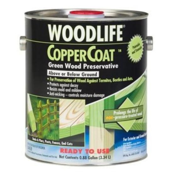 This new product replaces below ground wood preservative. Multipurpose insecticidal wood preservative pre-treatment for exterior below ground contact, fresh-water contact, and above ground applications. Prevents attacks from termites and other wood boring insects while it protects against rot and decay. Inhibits mold, mildew and staining, and staining fungi. EPA registered. Anti-wicking property resists moisture absorption, controls warping, swelling, and end checking. Imparts a transparent green color that naturally fades over time. Paintable and stainable. Easy soap and water clean up. Water-base formula. Contains Copper Naphthenate. Covers approximately 200 sq ft to 350 sq ft per gallon.