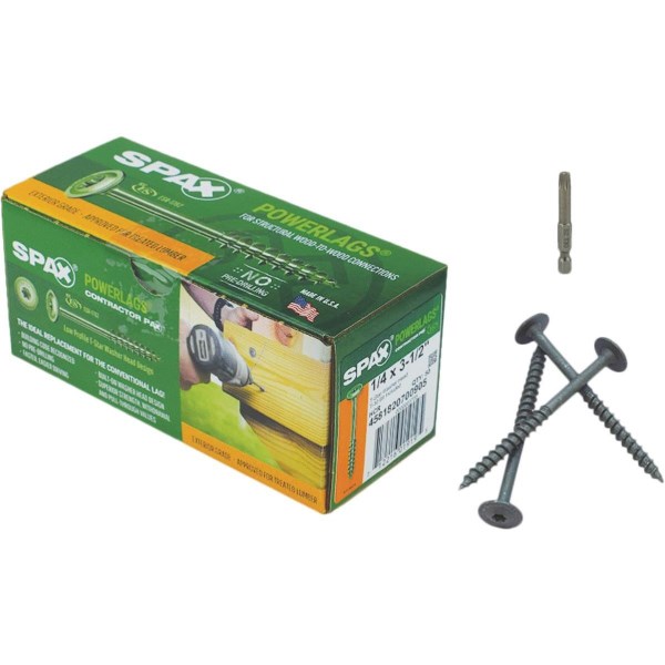 Spax PowerLags Screws have a washer head with T-Star Drive and HCR (High Corrosion Resistant) exterior coating. Provides a new level of fastening efficiency and reliability to construction. Engineered specifically for demanding wood-to-wood structural applications, PowerLags feature patented thread serrations that eliminate pre-drilling and dramatically increase installation speed – requiring up to 40% less driving torque to increase installation speed. Fastener length stamp on the head provides convenient identification without measuring and aids on-site inspections. HCR Coating offers superior exterior corrosion resistance when installed in treated lumber and is tested in coastal construction environments. All Spax PowerLags are building code listed and load rated, ICC-ES ESR-1782.